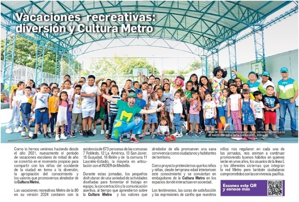Como lo hemos venimos haciendo desde el año 2021, nuevamente el período de vacaciones escolares de mitad de año se convirtió en el momento propicio para compartir con los niños del occidente de la ciudad en torno a la diversión, la apropiación del conocimiento y los valores que promovemos alrededor de la Cultura Metro.
